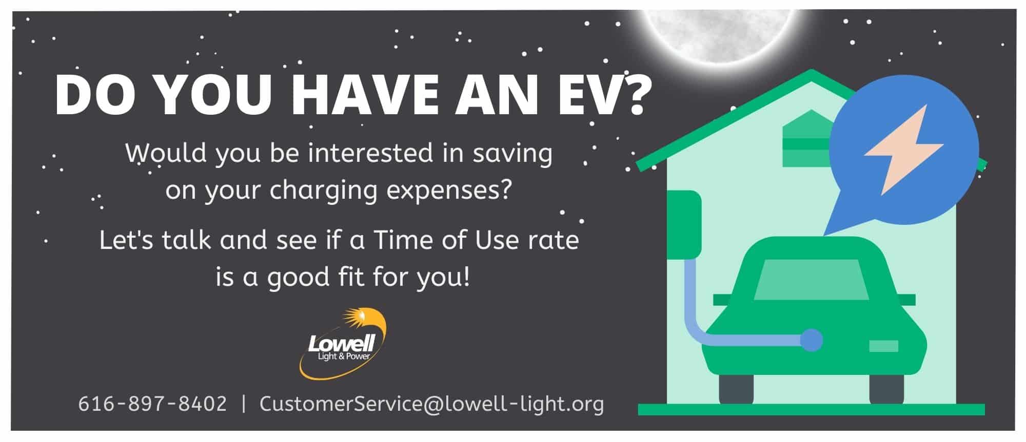 Do you drive an Electric Vehicle? Do you charge your EV at home? We may be able to help lower Lowell Light & Power customers’ EV charging expenses with a Time of Use rate. If you are interested in seeing if this could be a good fit for you, give us a call today.