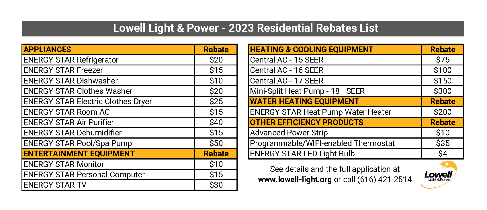 Before purchasing a new appliance, we hope you will make sure the one you want is an energy efficient appliance! If it is, you’ll likely be eligible for a rebate of $10 – $300 from Lowell Light & Power.